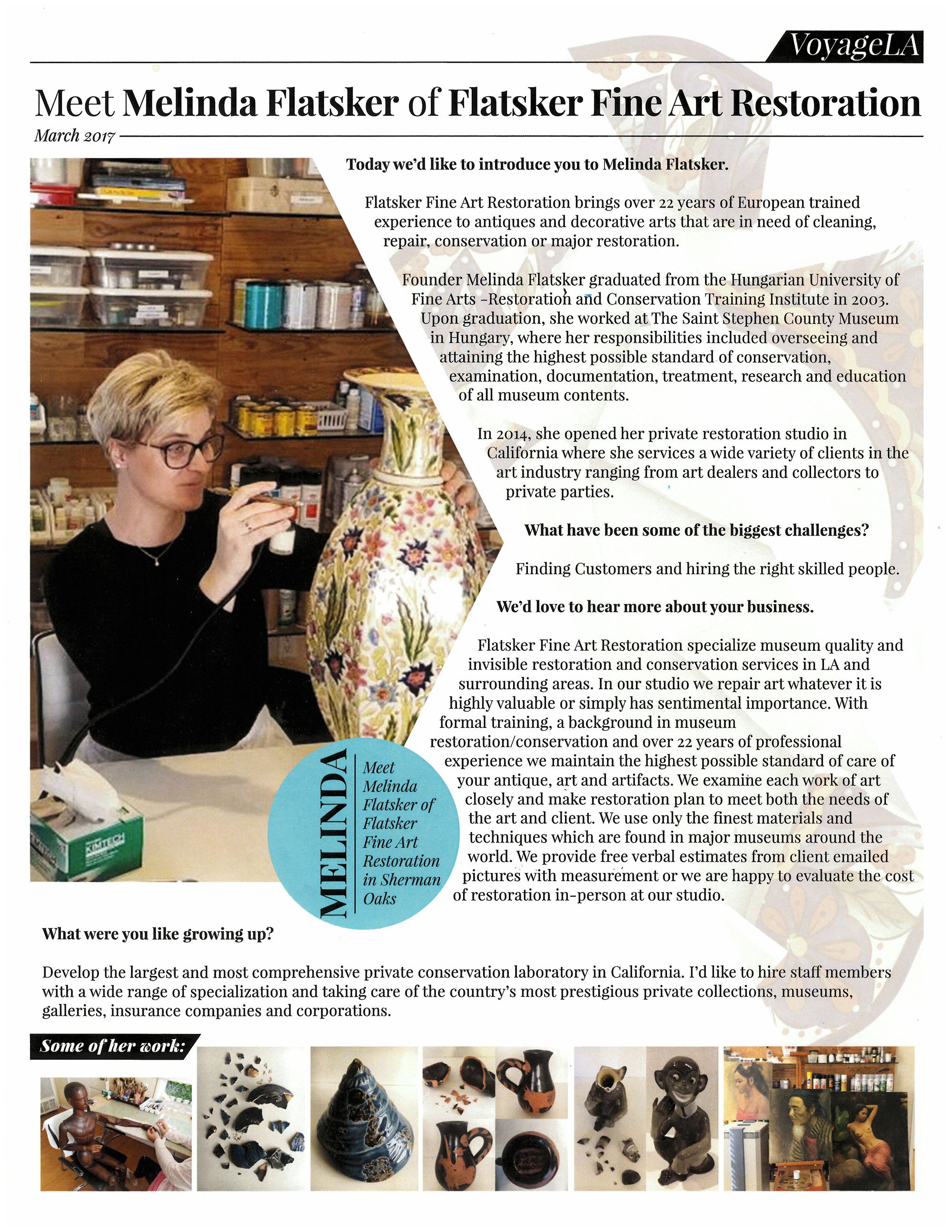 In 2010 she opened her private restoration studio in California where she services a wide variety of clients in the art industry ranging from art dealers and collectors to private parties.